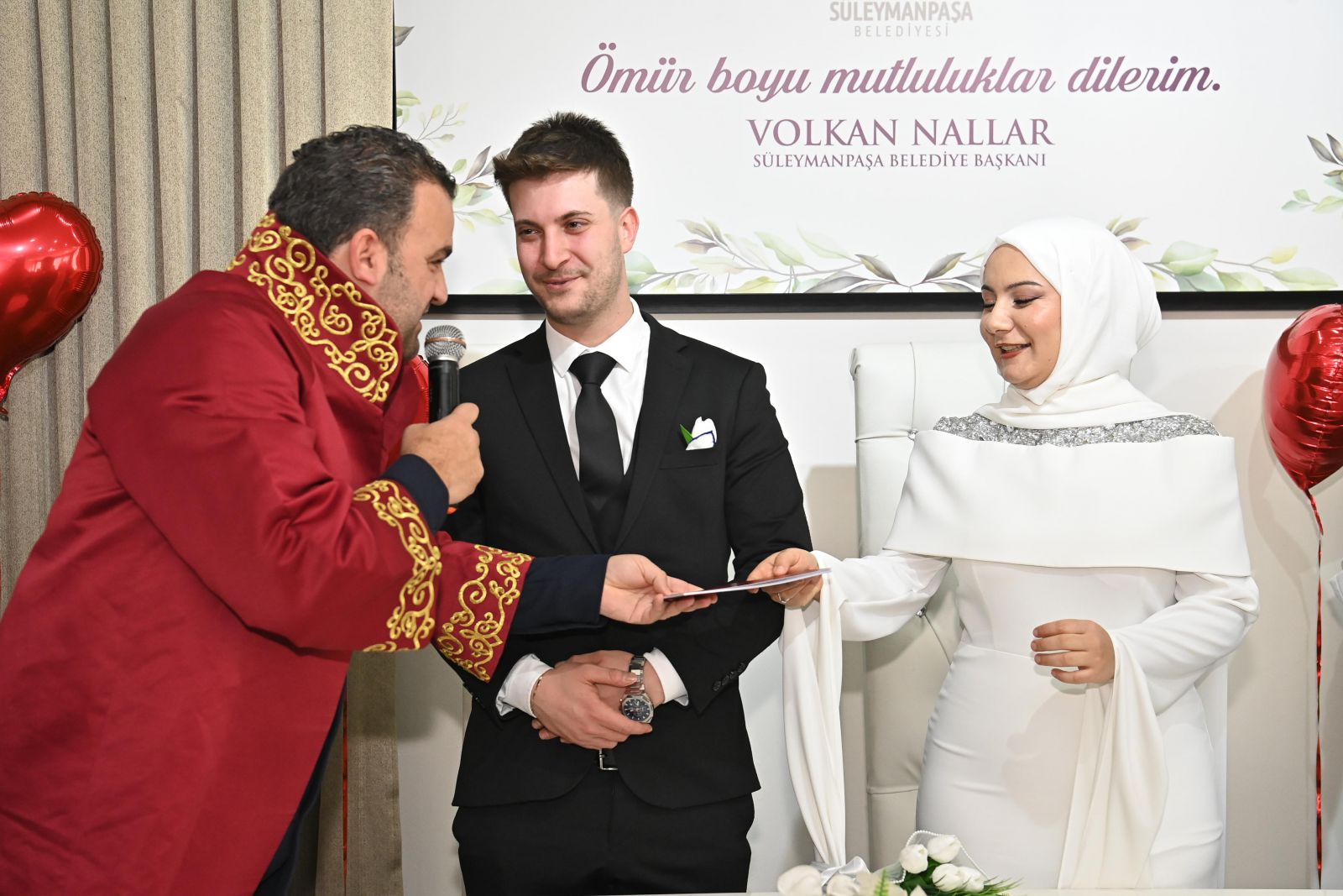 Günün en büyük sürprizi, çiftlerin en mutlu anına Belediye Başkanı Volkan Nallar'ın eşlik etmesi oldu. Genç çiftlerin nikâh akitlerini bizzat gerçekleştiren Başkan Nallar, çiftlerin heyecanına ortak olarak onlara bir ömür boyu mutluluklar diledi.