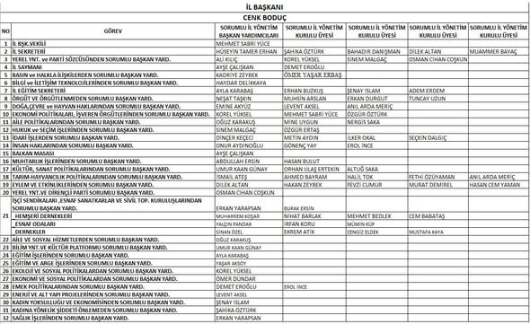 İdari işlerden Dinçer Keçeci, insan haklarından Onur Aydınoğlu, kültür ve sanat politikalarından Umur Kaan Günay, tarım ve hayvancılıktan İsmail Ateş, eylem ve etkinliklerden Dilek Altan sorumlu olacak.