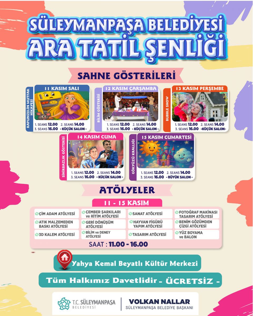 Süleymanpaşa Belediyesi, ara tatili çocuklar için unutulmaz bir şenliğe dönüştürüyor. 11-15 Kasım tarihleri arasında Yahya Kemal Beyatlı Kültür Merkezi’nde gerçekleştirilecek Ara Tatil Şenliği, çocuklara dolu dolu bir program sunacak.
