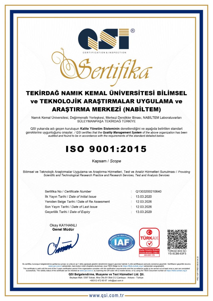 Tekirdağ Namık Kemal Üniversitesi Merkez Laboratuvarı NABİLTEM’in ISO 9001:2015 belgesi yenilendi.